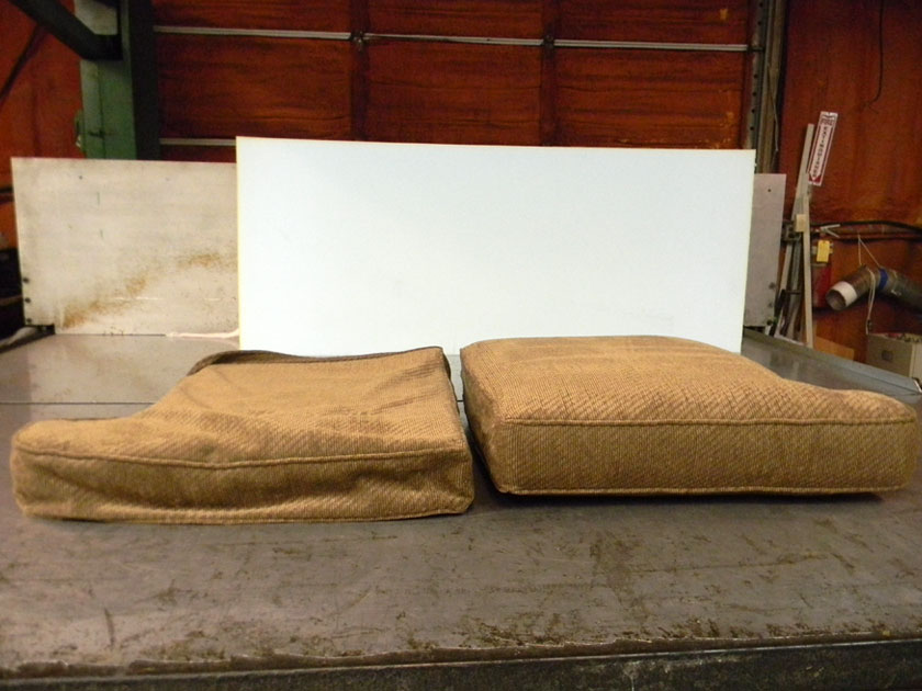 Bring in your couch cushions with the covers on them. We will take a measurement and give you an exact price. We have three levels of firmness to choose from. You will be able to have a side by side comparison to select the firmness that best suits you. If it something you like it takes 15 minutes per cushion. If you have multiple cushions you can drop them off and come back later to pick them up. Every cushions finished by the end of the workday.